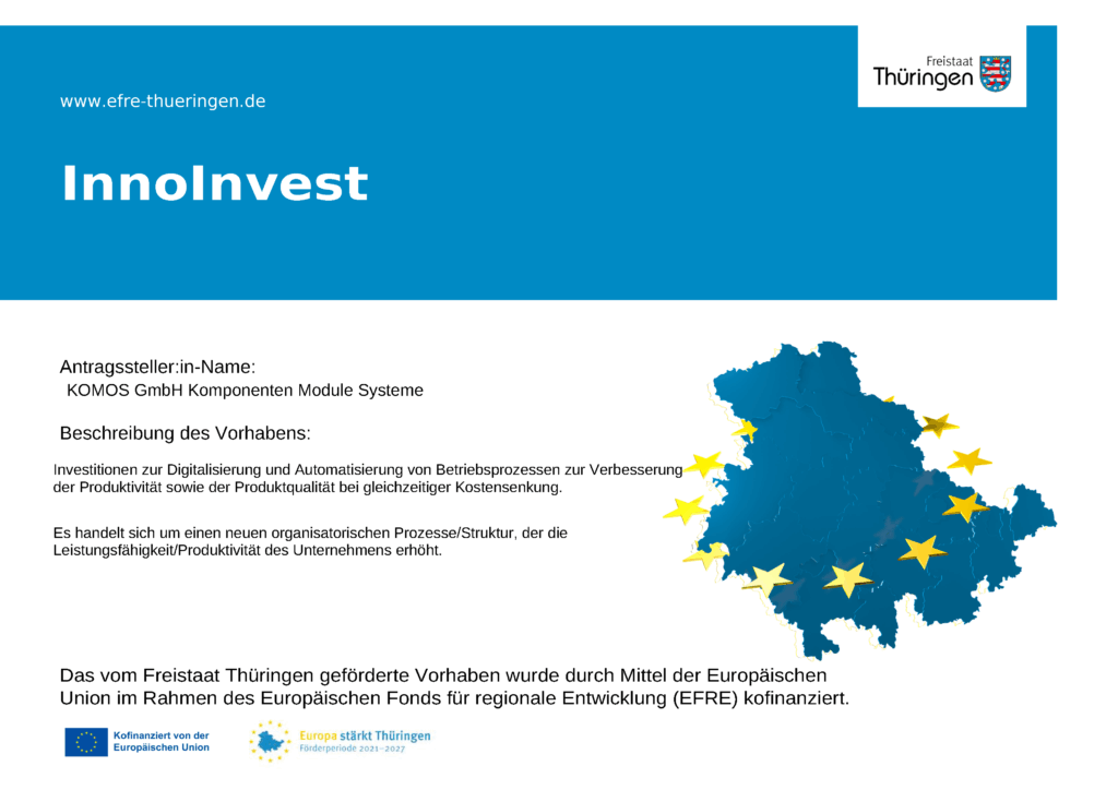 Mit Unterstützung des Europäischen Fonds für regionale Entwicklung (EFRE) und dem Freistaat Thüringen investiert die KOMOS GmbH gezielt in die Digitalisierung und Automatisierung ihrer Betriebsprozesse. Ziel ist es, Produktivität und Qualität zu steigern, Prozesse zu optimieren und gleichzeitig die Kosten zu senken. Durch neue digitale Strukturen schaffen wir die Grundlage für effizientere Abläufe in Entwicklung, Fertigung und […]